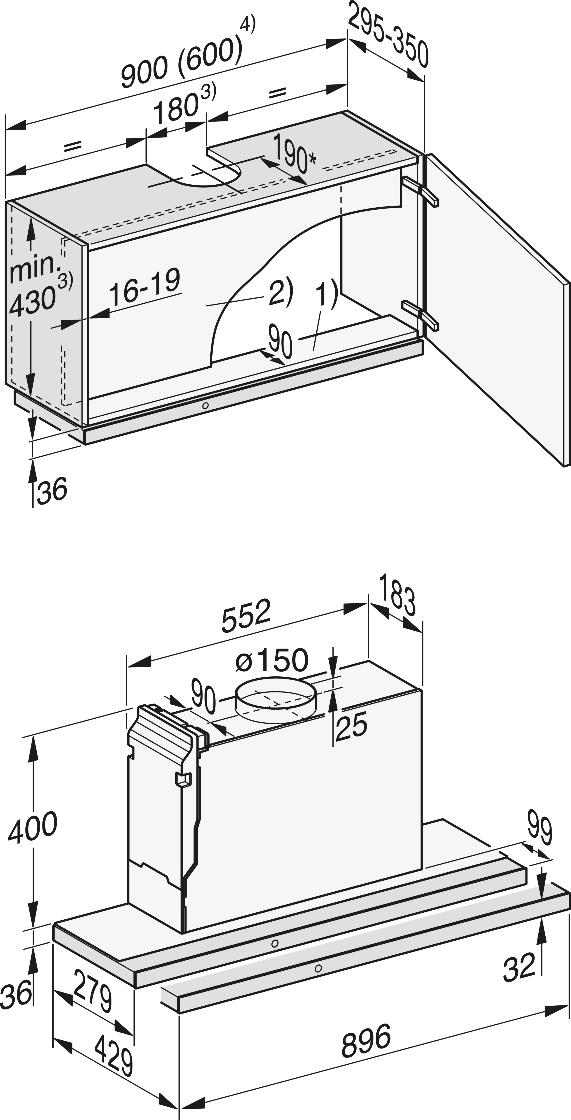Схема встраивания для кухонной вытяжки Miele DAS 4930 OBSW