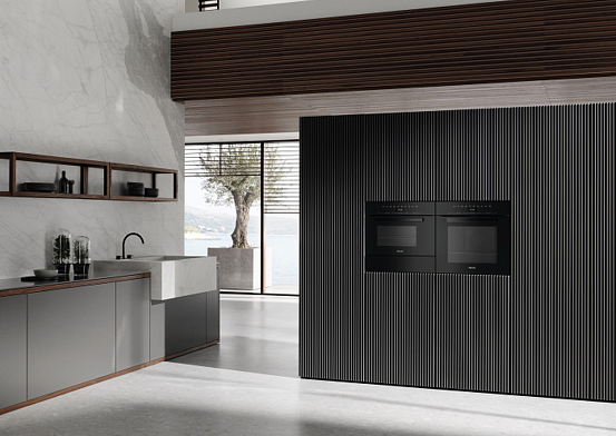 Духовой шкаф Miele H 7840 BMX OBSW привлекательного цвета «чёрный обсидиан» относится к лимитированной линейке ArtLine. В неё входят приборы, которые имеют сдержанный дизайн, лаконичное исполнение. При этом ручка отсутствует. Чтобы открыть дверцу, необходимо воспользоваться опцией Touch2Open. Легко прикоснитесь к поверхности — и механизм сработает. Кроме того, данное устройство имеет необычную функцию MotionReact. Чувствительные датчики активизируются, когда вы к ним приближаетесь. Они включают освещение панели управления и рабочей камеры. Если звучит сигнализация об окончании приготовления, то они её деактивируют.