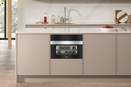 Винный холодильник Miele KWT 7112 iG EDST/CS — встраиваемая модель, которая позволяет хранить до 18 бутылок одновременно. Светодиодная подсветка не повышает температуру в холодильном отделении. Технология DynaCool обеспечивает равномерное охлаждение.