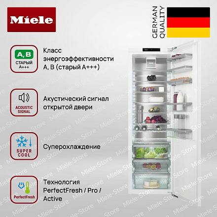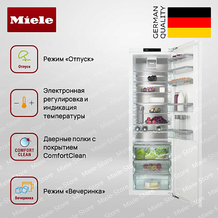 Встраиваемый холодильник Miele K 7777 B – это идеальное сочетание элегантного дизайна и передовых технологий. Его изысканный внешний вид гармонично впишется в интерьер любой кухни, благодаря чему он станет неотъемлемой частью вашего пространства. Этот прибор изготовлен в Германии, что гарантирует его высокое качество и надежность. Высота устройства составляет 177 см, ширина 55.9 см, а глубина 54.6 см, что позволяет ему легко интегрироваться в кухонный гарнитур. Конструкция ComfortSize позволяет разместить противень на нижнем уровне, что добавляет удобства в использовании. Дверь снабжена петлями справа, а система SoftClose и SelfClose обеспечивают плавное и тихое закрытие.