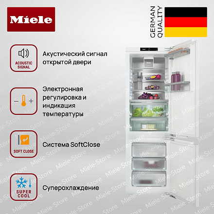 Встраиваемый холодильник с морозильником Miele KFN 7774 B — гармоничное сочетание немецкого качества, инновационных технологий и продуманного современного дизайна. Модель выполнена в лаконичном стиле, что позволяет ей органично вписаться в любую кухонную мебель. Высота конструкции составляет 177 см, ширина — 55,9 см, а глубина — 54,6 см, благодаря чему техника идеально подходит для ниш стандартных размеров. Слайдерное крепление фасада обеспечивает надежную фиксацию и легкость монтажа, а максимальный вес дверцы до 18 кг позволяет использовать даже массивные панели. Элегантное внутреннее пространство, отделанное безопасным стеклом и покрытием CleanSteel, выглядит стильно и легко очищается от отпечатков и загрязнений.