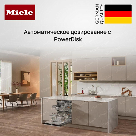 Посудомоечная машина Miele G7695 SCVi XXL — модель с рекордно большой загрузкой, вмещает до 14 стандартных комплектов. Функция автоматического дозирования AutoDos с интегрированным PowerDisk — инновация на рынке бытовых приборов. Моющий порошок поступает в рабочую камеру на определенном этапе, точное дозирование возможно благодаря картриджу PowerDisk, рассчитанному на 20 циклов мытья. Это удобно, поскольку пользователю не нужно досыпать моющее средство или добавлять таблетку 3 в 1 при каждой мойке.