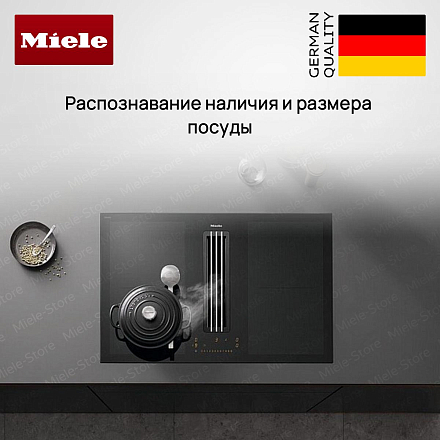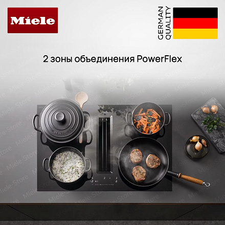Miele KMDA 7676-1 FL — современное решение для тех, кто ценит минимализм и технологичность на кухне: индукционная поверхность с интегрированной вытяжкой объединяет функциональность и строгую эстетику. Чёрная стеклокерамика подчёркивает мебельный интерьер, накладной вариант без рамы позволяет выполнить встраивание заподлицо, а защитная решётка выполнена в чёрном цвете, что обеспечивает единство оформления. Четыре конфорки оснащены интеллектуальными зонами PowerFlex в двух размерах для гибкой расстановки посуды: две зоны PowerFlex (150×230 мм с номинальной мощностью 2 100 Вт и режимом Booster до 3 000 Вт, TwinBooster до 3 650 Вт — позиция левая; две крупные зоны 230×460 мм с мощностью по 3 400 Вт, Booster до 4 800 Вт и TwinBooster до 7 300 Вт — правая позиция) дают возможность готовить в крупных ёмкостях или одновременно на нескольких поверхностях.
