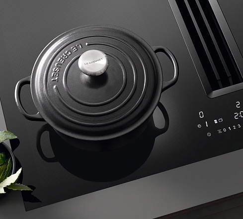 Также есть функции PowerFlex и TwinBooster, которые обеспечивают максимальную эффективность и гибкость при приготовлении пищи. Но это не все. Индукционная панель Miele KMDA 7676 FL оборудована встроенной вытяжкой, которая обеспечивает эффективное удаление запахов и дыма. Мощность вытяжки варьируется от 195 м³/ч на минимальной скорости до 610 м³/ч на интенсивной ступени. Уровень шума при этом остается приемлемым, не превышая 53 дБ на максимальной скорости. Встроенный охлаждающий вентилятор, защита от перегрева и индикатор остаточного тепла обеспечивают безопасность использования панели. Блокировка запуска и функция защитного отключения предотвращают случайное включение или перегрев устройства.